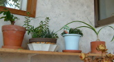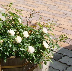 最近になりやっと咲いたバラの花、そして入り口でポーチュラカの花がお出迎え