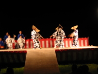 夕食後、ホテルのバスで海岸の「春日崎特設ステージ」に出かけ、鬼太鼓、相川甚句、相川音頭、佐渡おけさを見学しました。