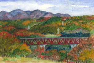 赤い橋です。辺りの山々の紅葉が光に映えて
