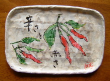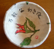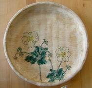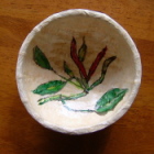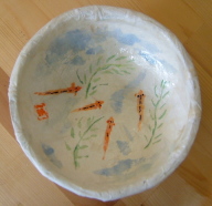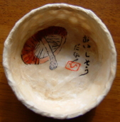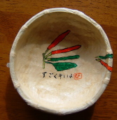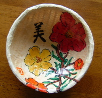 かごにぺたぺたと和紙を張り、乾いたら絵を描いてみましょう。