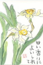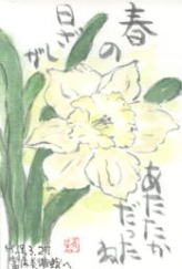 暖かい日、寒い日、が交互にやってくる・・・ そして本当の春がやってくる。 いち早く咲く水仙の花。春の日ざしを待ちわびていたように あちこちで群がって咲いている・・・ 「これ絵手紙にかいて」と水仙の花束を頂きました。 よく見るととても可愛くてきれいで、いろいろな種類がある ものですね。 次々咲く花にうっとりしているうちにもう辺りは新緑の季節・・・・