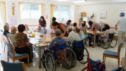 P..M.2時…午後の日差しの差し込む部屋には杖を突いたり車椅子に乗った