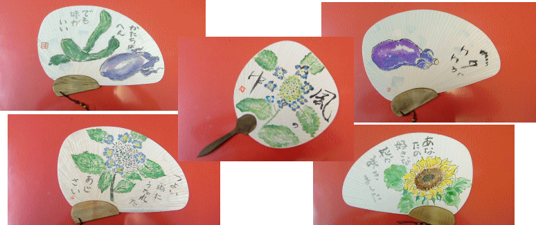 昔ながらの扇子やうちわに絵を描いてみました。こんなに素敵な作品が出来上がりました。