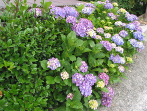 雨に似合う花 やっぱり紫陽花。我が家の一番大きな 紫陽花は光を求めて屋根の上まで伸び てしまった。それでも坂の上に顔を出し 元気に咲いている。