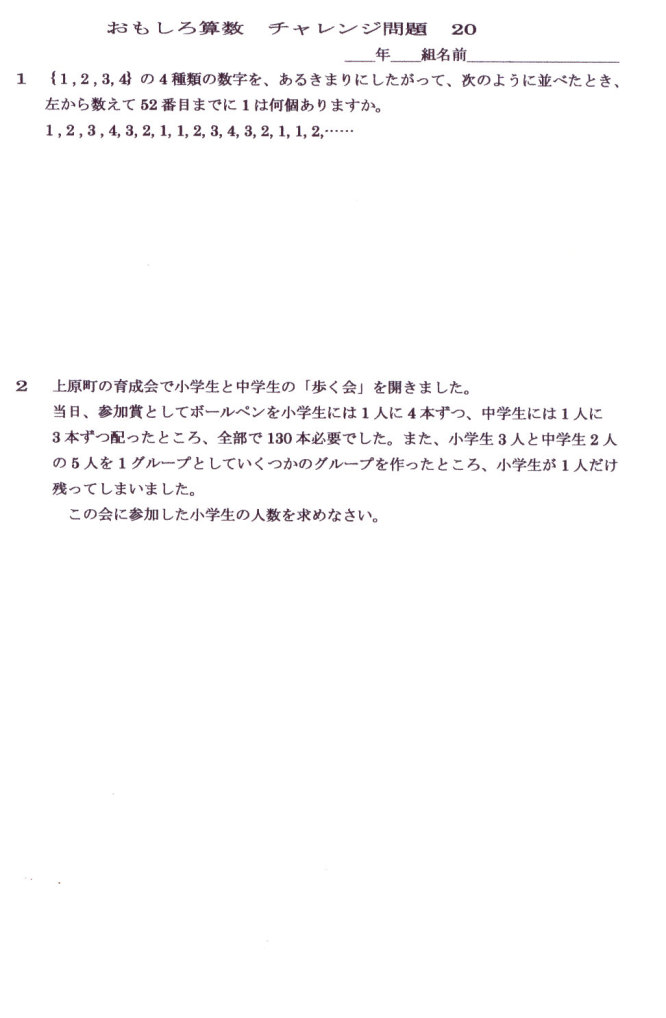 {1,2,3,4,3,2,1}の7つの数字のグループの繰り返しで並んでいるから 52÷7=7…3から7グループとあまりの{1,2,3,…}の3番目までである。 1グループには1が2個含まれていて、あまりの中の1の1個と合わせて 2×7+1=15(個)