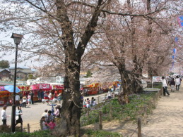 みそ料理の出店の並ぶ桜並木の外