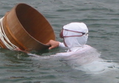 【海女の実演】 昔ながらの白磯着に身をまとった海女たちが