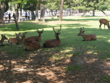 興福寺の回りは奈良公園になっていて、沢山の鹿たちが草を食べたり寝そべったりしている。鹿せんべいを買って手にすると