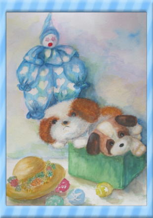 机の上の人形達 可愛い人形達をちょっと春らしい 色使いで描いてみました。