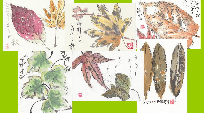きれいに色づいた落ち葉を拾って、うつして見ました。ちょっと薄めの墨を木の葉に塗って「ペタッ」と押すだけ