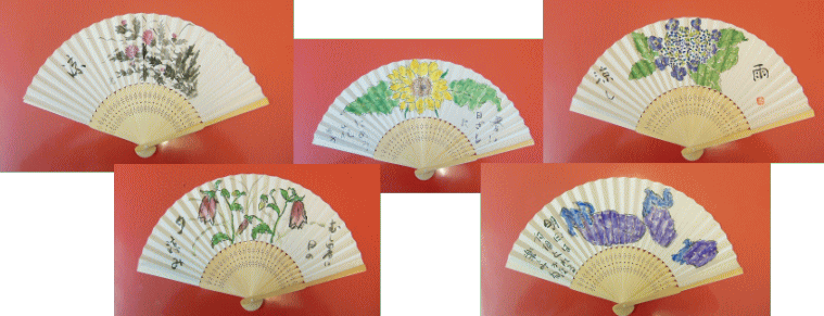 昔ながらの扇子やうちわに絵を描いてみました。こんなに素敵な作品が出来上がりました。