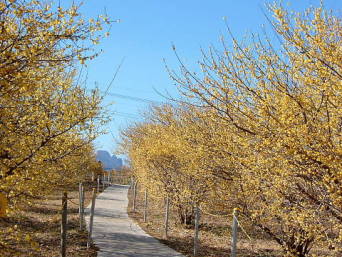 12月中旬から3月初旬まで咲いています。面積2.5ha、1000株10000本の蝋梅が咲いています。