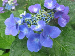 雨に似合う花 やっぱり紫陽花。我が家の一番大きな 紫陽花は光を求めて屋根の上まで伸び てしまった。それでも坂の上に顔を出し 元気に咲いている。