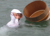 【海女の実演】 昔ながらの白磯着に身をまとった海女たちが