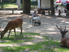 この公園に沿った道を若草山の方向に、車椅子を押してもらい15分位行くと次の見学場所【東大寺】へと続く。